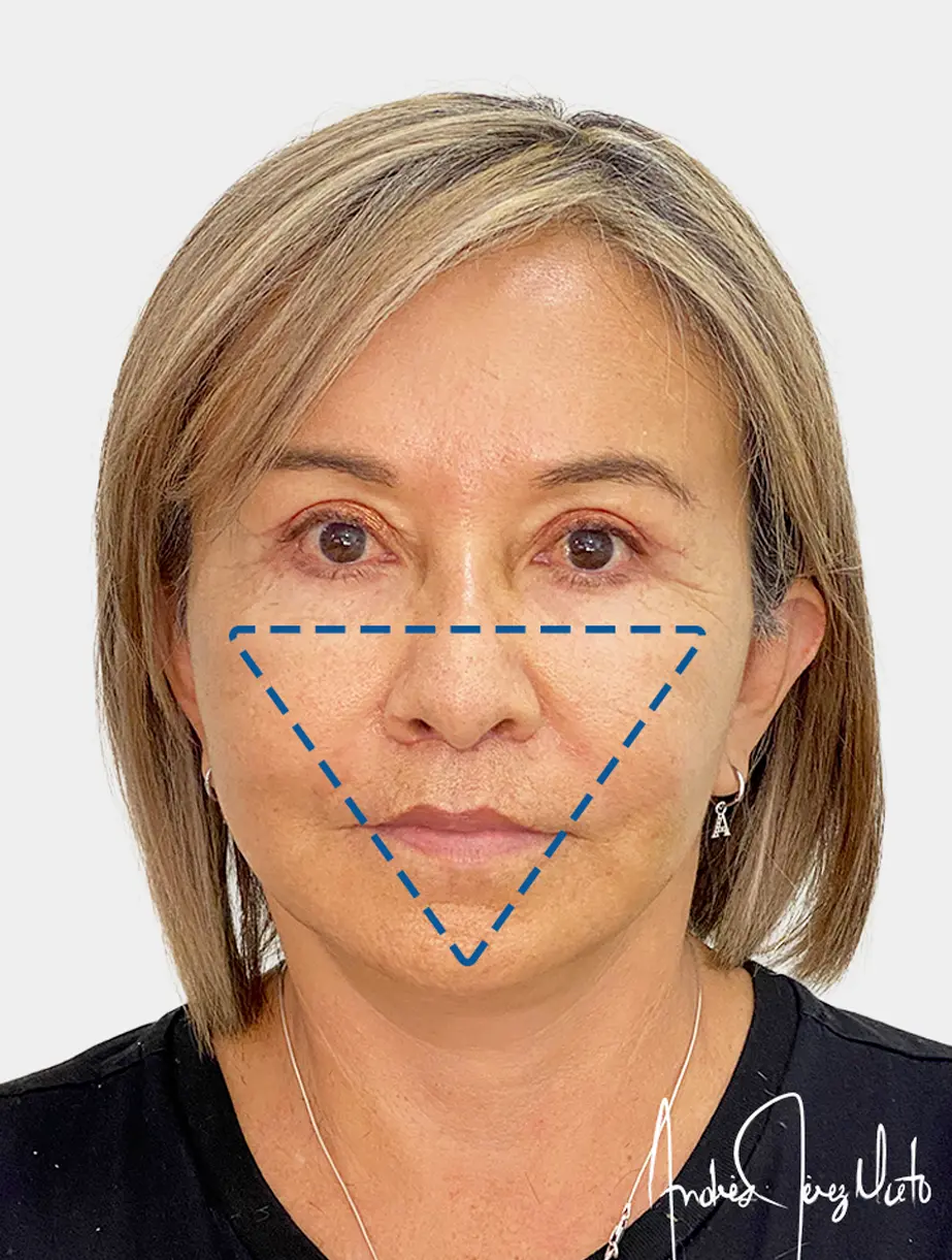 One of the most evident and transformative changes of facial aging is the progressive descent of soft tissues. This displacement occurs vertically, starting in the upper part of the face and advancing towards the lower area, causing a loss of firmness and definition.